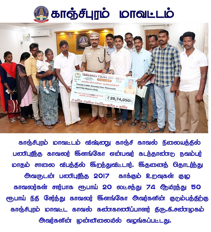 காஞ்சிபுரம் மாவட்டம் விஷ்ணு காஞ்சி காவல் நிலையத்தில் பணிபுரிந்த காவலர் இளங்கோ என்பவர் கடந்தாண்டு நவம்பர் மாதம் சாலை விபத்தில் இறந்துவிட்டார். இது தொடர்பாக காவலர் இளங்கோ அவர்களின் குடும்பத்திற்கு அவருடன் பணிபுரிந்த 2017 காக்கும் உறவுகள் குழு காவலர்கள் சார்பாக ரூபாய் 20 லட்சத்து 74 ஆயிரத்து 50 ரூபாய் நிதி சேர்த்து காவலர் இளங்கோ அவர்களின் குடும்பத்திற்கு காஞ்சிபுரம் மாவட்ட காவல் கண்காணிப்பாளர் சண்முகம் முன்னிலையில் காவலர்கள் கமல்ராஜ், விக்னேஷ், தமிழ் குமரன், மற்றும் செல்வ குமார் சேர்ந்து இளங்கோவின் குடும்பத்தினரிடம் ஒப்படைத்தனர்.