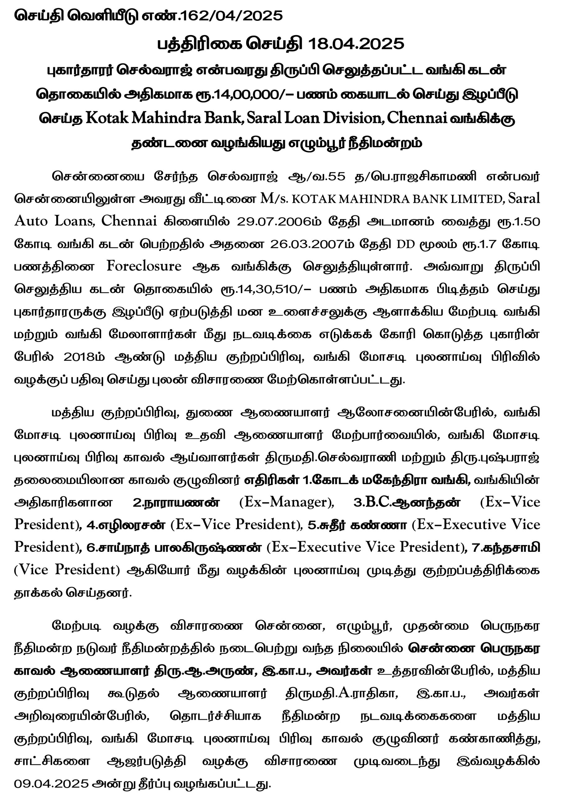 இது தொடர்­பாக சென்னை மத்­திய குற்­றப்­பி­ரிவு போலீசார் வெளியிட்­டுள்ள செய்­திக்­கு­றிப்பு விவ­ரம்: