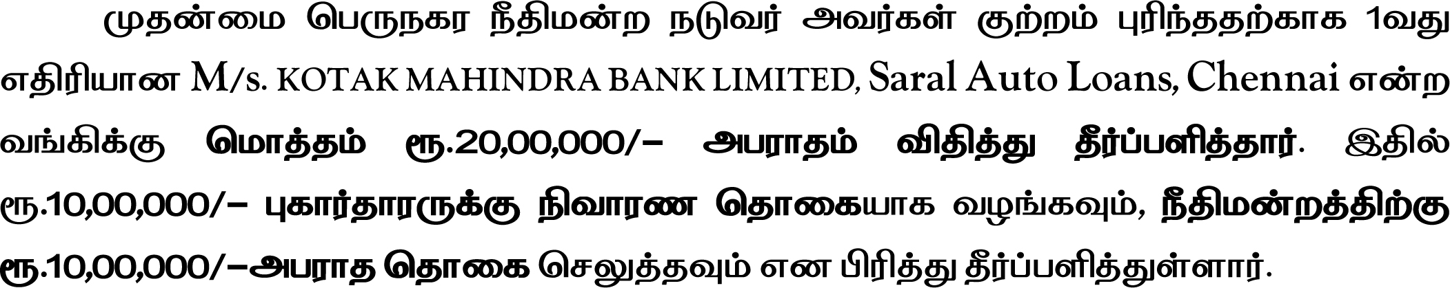 வாடிக்­கை­யா­ளரின் பணத்தை கையா­டல் செய்­தது தொடர்­பான வழக்கு விசா­ர­ணையில், கோட்டக் மஹிந்­திரா வங்­கிக்கு ரூ. 20 லட்சம் அப­ராதம் சென்னை எழும்பூர் கோர்ட் அதி­ரடி தீர்ப்­பு வழங்கி உத்­த­ர­விட்­டுள்­ளது: