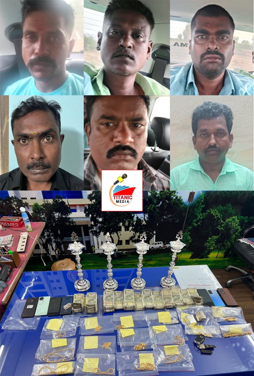தனிப்படை காவல் குழுவினர் பல்வேறு கோணங்களில் தீவிர விசாரணை செய்து சிவ­கங்­­கை­யைச்­ சேர்ந்த பிரபு (எ) கமல் (36), முத்து ராமலிங்கம் (45), தீனா (எ) தினகரன் (36), பிரேம்குமார் (38), முத்துலிங்கம் (42), பிரபு (42) ஆகிய 6 நபர்களை சிவகங்கை மற்றும் மானாமதுரையில் வைத்து கைது செய்தனர். அவர்களிடமிருந்து 203 கிராம் தங்க நகைகள், வெள்ளி கட்டிகளுடன் 3.2 கிலோ வெள்ளிப்பொருட்கள், பணம் ரூ.6.50 லட்சம் மீட்கப்பட்டது. குற்ற சம்பவத்திற்கு பயன்படுத்திய 7 செல்போன்கள் மற்றும் 1 கார் பறிமுதல் செய்யப்பட்டது.