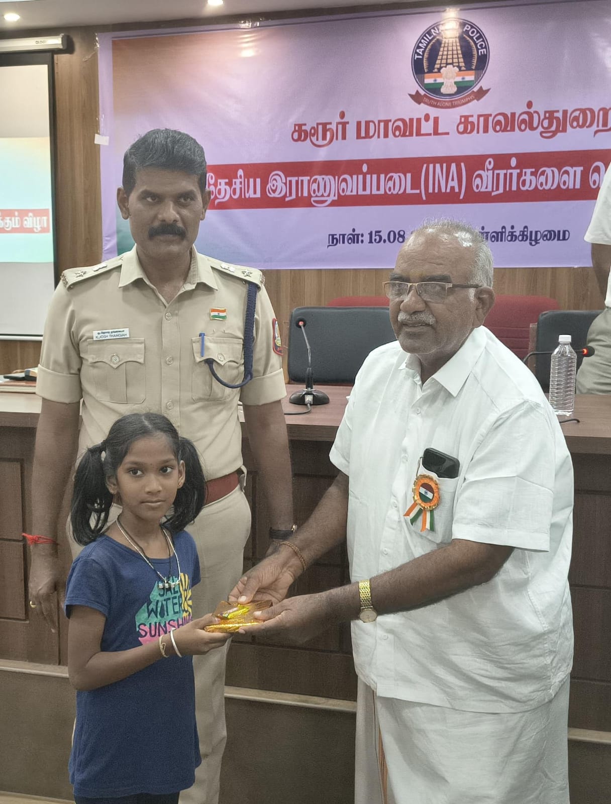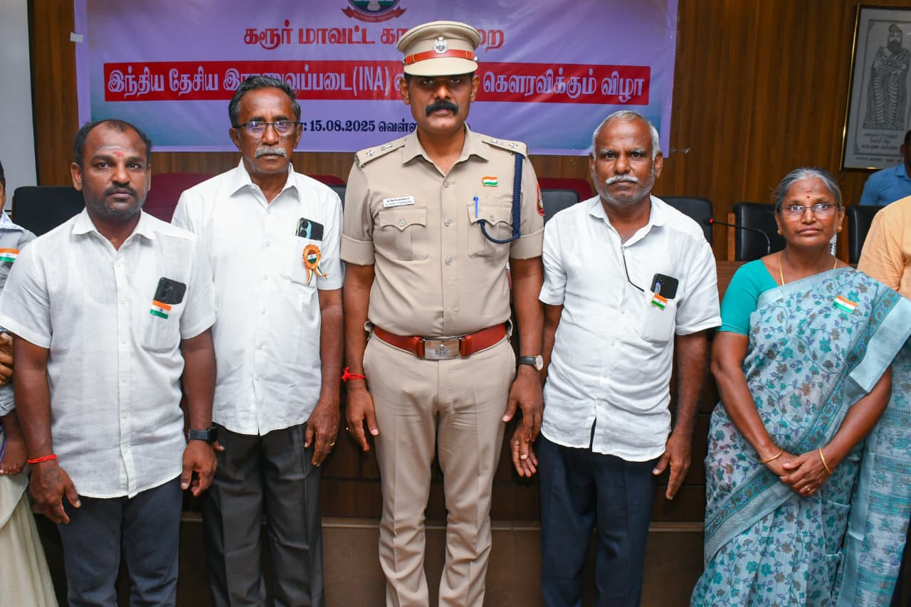 15.08.2025 79 ஆம் ஆண்டு சுதந்திர தினத்தை முன்னிட்டு கரூர் மாவட்டத்தைச் சேர்ந்த சுதந்திரப் போராட்டத் தியாகிகளை கவுரவப்படுத்தும் விதமாக கரூர் மாவட்ட காவல்துறை சார்பில் மாவட்ட ஆட்சியர் அலுவலகத்தில் விழா ஏற்பாடு செய்யப்பட்டு இருந்தது.