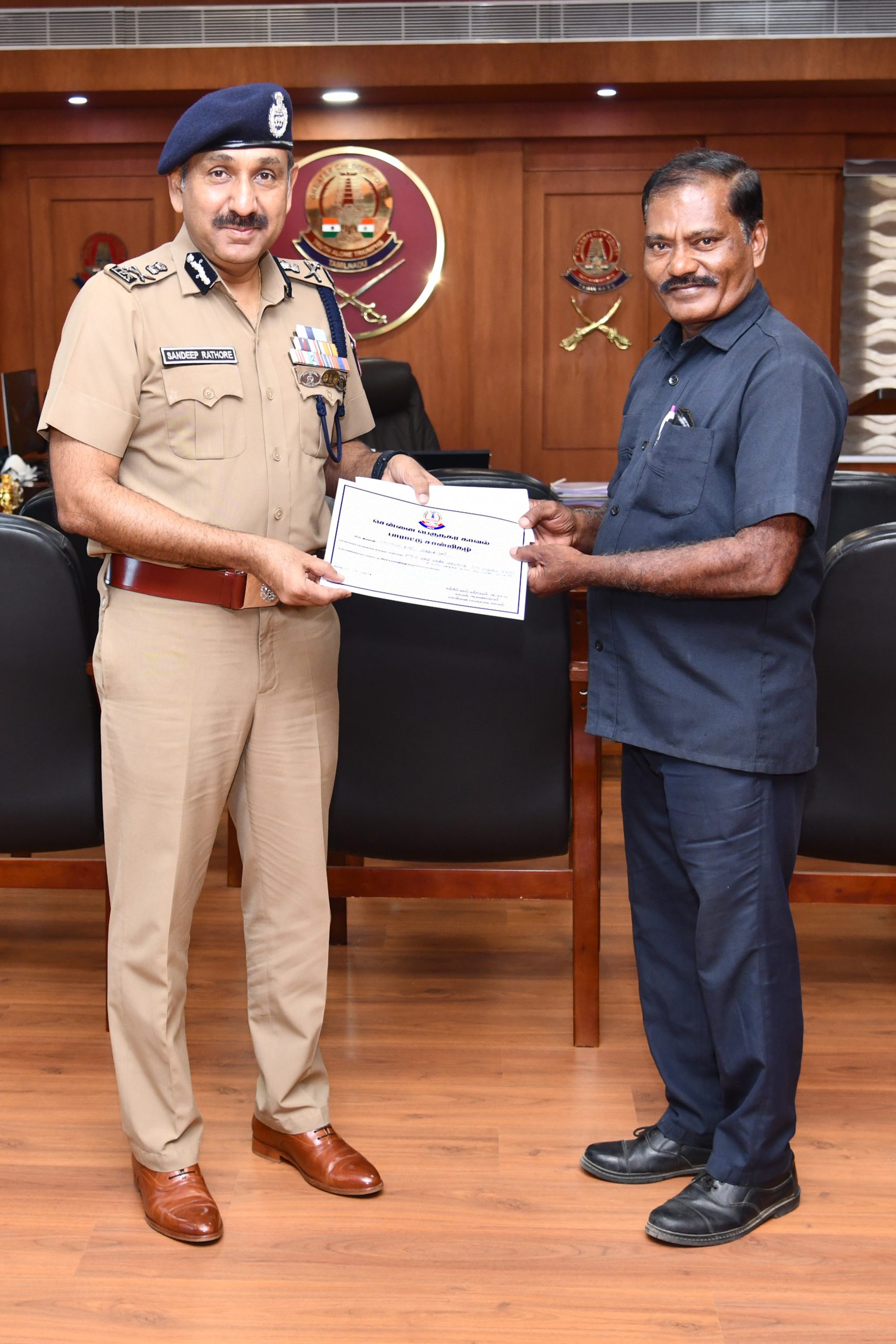 கேகே நகர் வங்கி ஏடிஎம் மையத்தில் இருந்த ரூ.18 ஆயிரம் பணத்தை கே.கே. நகர் காவல் நிலையத்தில் ஒப்படைத்த நபரை கமிஷனர் சந்தீப்ராய் ரத்தோர் நேரில் அழைத்து அவரது நேர்மையை பாராட்டி வெகுமதி மற்றும் சான்றிதழ் வழங்கினார்.