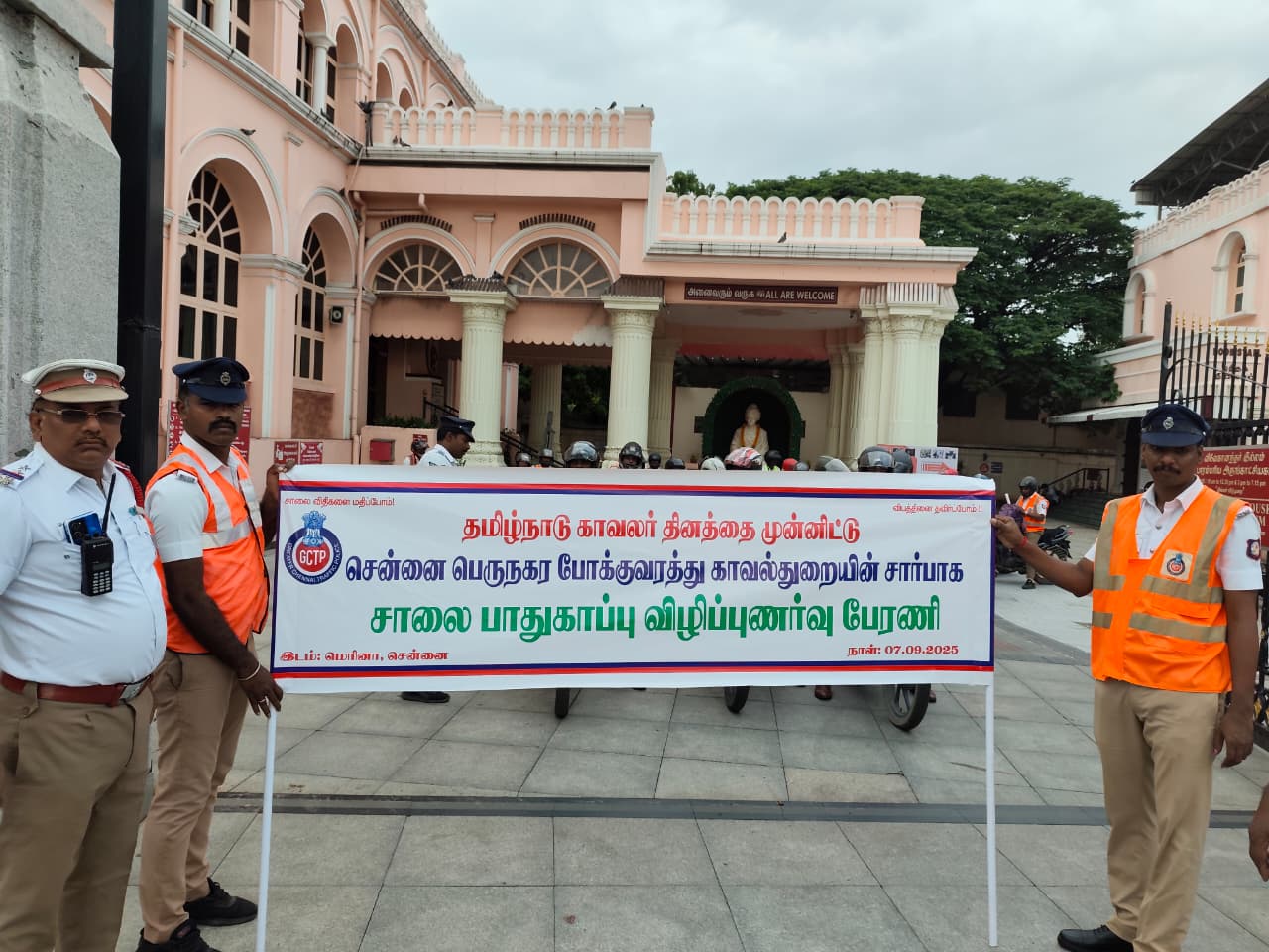 செப்டம்பர் 6 காவலர் தினத்தை முன்னிட்டு இன்று (7.9.25) காலை பூந்தமல்லி நெடுஞ்சாலையில் அமைந்துள்ள புனித ஜார்ஜ் பள்ளி முன்பாகவும் காமராஜர் சாலை பகுதிகளில் போக்குவரத்து போலீசார் இருசக்கர வாகனங்களில் பேரணியாக சென்று பொதுமக்களுக்கு போக்குவரத்து விதிமுறைகளை பொதுமக்கள் கடைபிடிக்க விழிப்புணர்வு ஏற்படுத்தினர்.