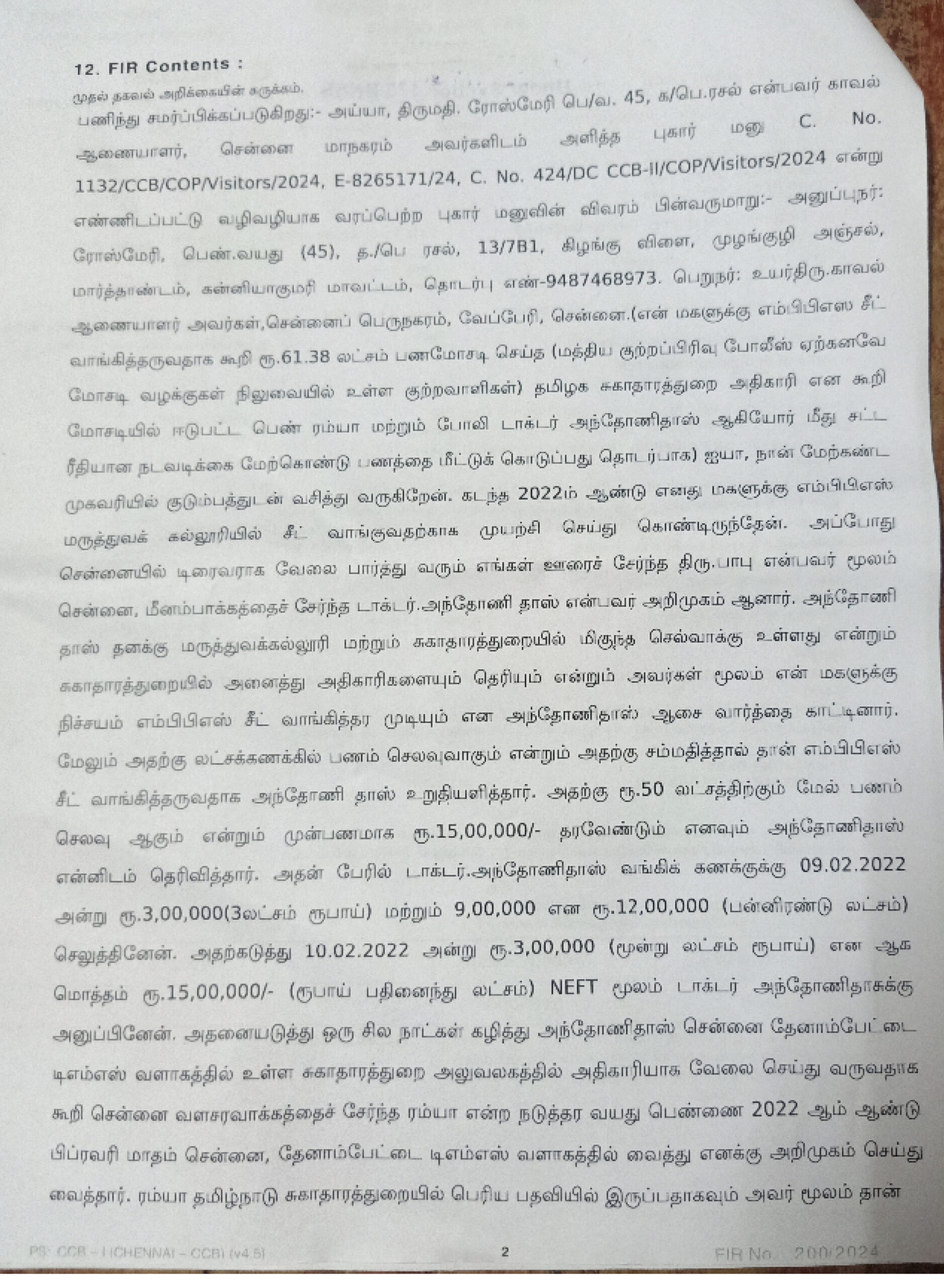 ரோஸ்மேரியை சென்னை தேனாம் பேட்டையிலுள்ள டிஎம்எஸ் அலுவலகம் வரச்சொல்லியுள்ளனர். ரோஸ்மேரியை நம்பவைத்து கடந்த 08.02.2022 முதல் 19.5.2022 வரை பல தவணைகளாக ரூ.60,50,000- பணத்தை வங்கி மூலமாகவும், ரொக்கமாகவும் பெற்றுள்ளனர். மேலும் ரோஸ்மேரியின் மகளுக்கு கல்லூரி அட்மிஷன் கிடைத்து விட்டதாக போலியான ஆர்டரையும் காண்பித்து விடுதி கட்டணம் கட்ட வேண்டும் என்று கூறி மேலும் ரூ.1,38,000- பணத்தை ரம்யா பெற்றுள்ளார். ஆனால் பணத்தை பெற்றுக் கொண்டு எம்பிபிஎஸ் சீட் வாங்கித்தராமல் காலதாமதம் செய்துள்ளனர்.