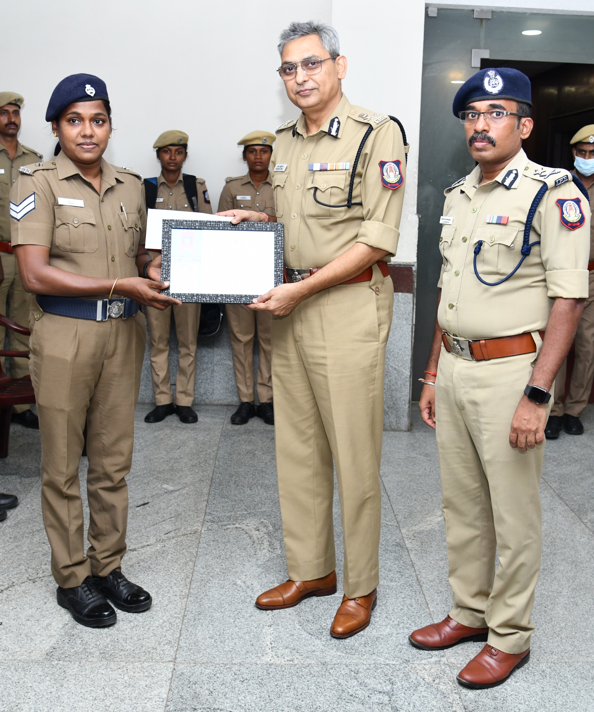 கடந்த மே மாதம் நட்சத்திர காவல் விருதுக்காக தேர்ந்தெடுக்கப்பட்ட மடிப்பாக்கம் காவல் நிலைய முதல்நிலை பெண் காவலரை கமிஷனர் சங்கர்ஜிவால் நேரில் அழைத்து நட்சத்திர காவல் விருதுக்கான பாராட்டு சான்றிதழ் மற்றும் வெகுமதி வழங்கி பாராட்டினார்.
