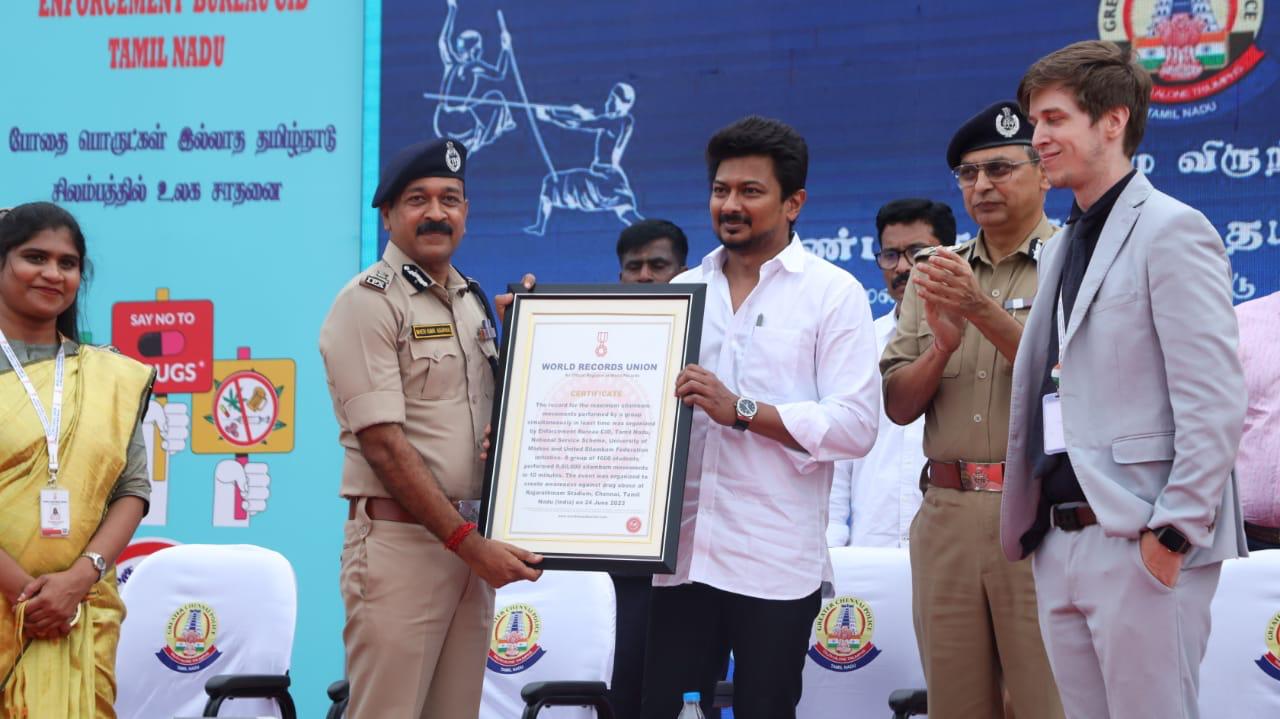 World Record Union-ஆல் வழங்கப்படும் இந்த உலக சாதனைக்கான சான்றிதழ் தமிழக அரசின் இளைஞர் நலன் மற்றும் விளையாட்டுத்துறை அமைச்சர் மாண்புமிகு திரு. உதயநிதி ஸ்டாலின் அவர்களிடம் வழங்கப்பட்டு, அவர் அச்சான்றிதழை அமலாக்கப்பிரிவு ஏடிஜிபி மகேஷ் குமார் அகர்வால் ஒப்படைத்தார்.