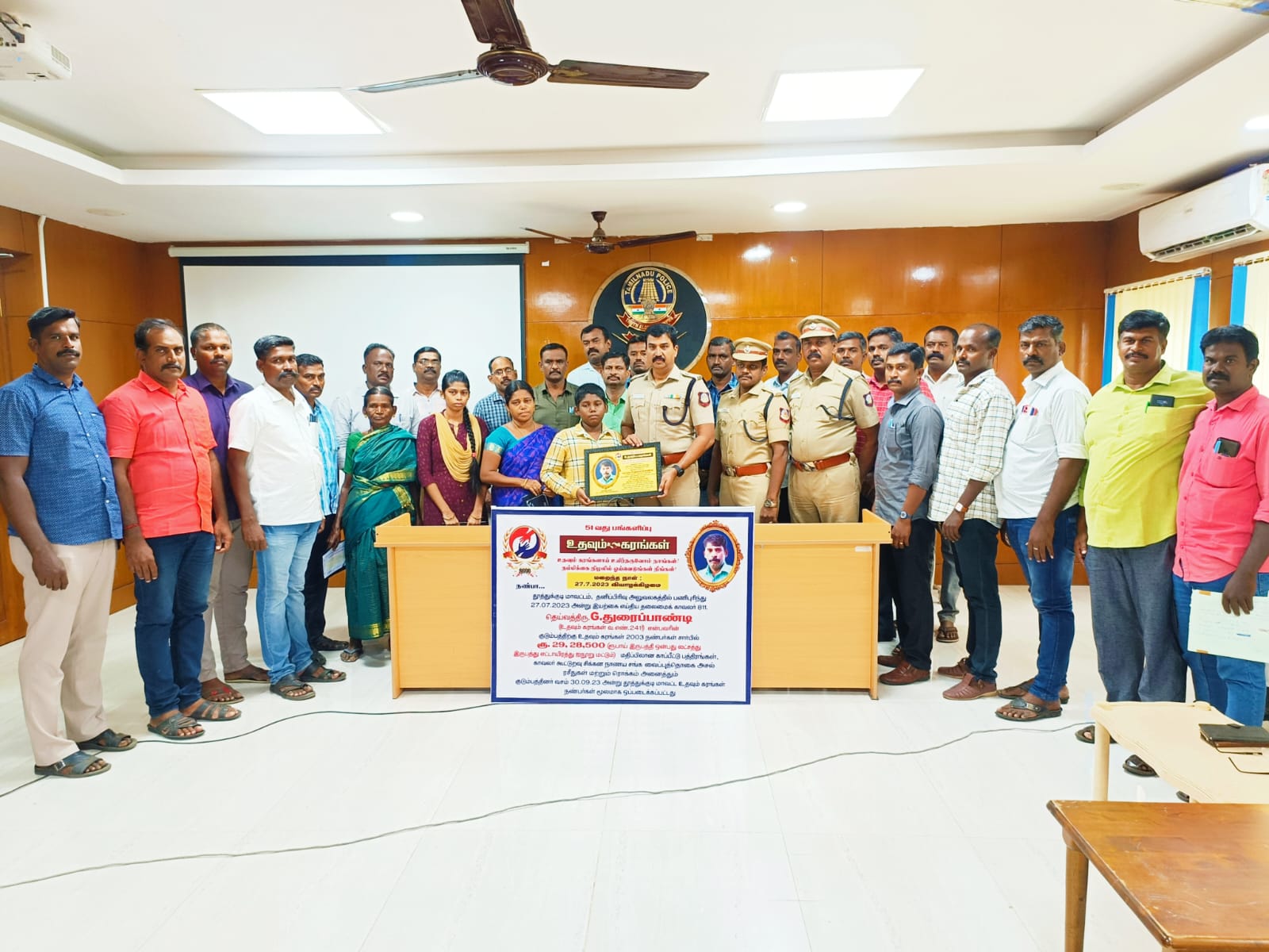தூத்துக்குடி மாவட்டம் காவல்துறை தனிப்பிரிவு அலுவலகத்தில் பணியாற்றி வந்த தலைமை காவலர் துரைபாண்டி கடந்த 27.07.2023 அன்று உடல்நலகுறைவால் காலமானார். துரைபாண்டி அவர்களது குடும்பத்திற்கு தனிப்பட்ட முறையில் தங்களால் இயன்ற நிதியுதவி செய்ய வேண்டும் என்ற கருணையுள்ளத்தோடு, அவருடன் 2003ம் ஆண்டு காவலர் பணியில் சேர்ந்த தமிழகம் முழுவதுமுள்ள சக காவலர்கள் ஒன்று திரண்டு உதவும் கரங்கள் 2003 சார்பாக ரூபாய் 29,28,500- பணம் நன்கொடையாக பெற்று, அவற்றை காப்பீட்டு பத்திரங்கள், காவலர் கூட்டுறவு சிக்கன நாணய சங்க வைப்புத் தொகை ரசீதுகளாக இன்று (30.09.2023) தூத்துக்குடி மாவட்ட காவல்துறை அலுவலகத்தில் 2003ம் ஆண்டு காவலர்கள் முன்னிலையில் மாவட்ட காவல் கண்காணிப்பாளர் டாக்டர் எல். பாலாஜி சரவணன் துரைப்பாண்டி குடும்பத்தினருக்கு வழங்கி ஆறுதல் கூறினார்.